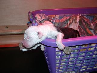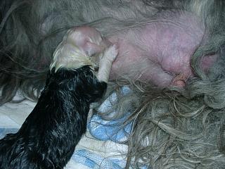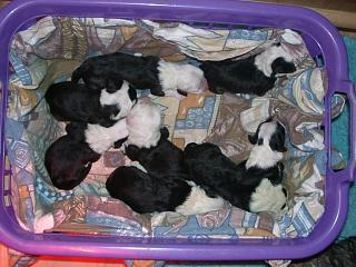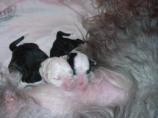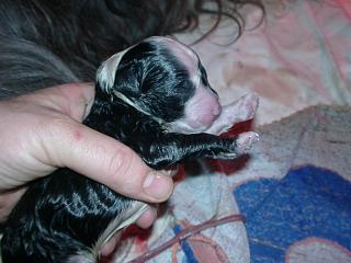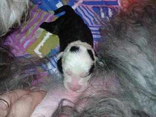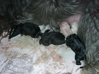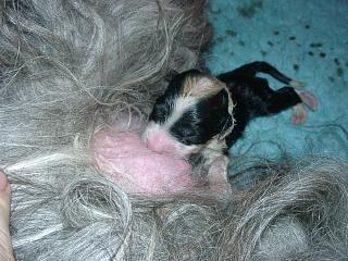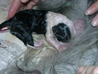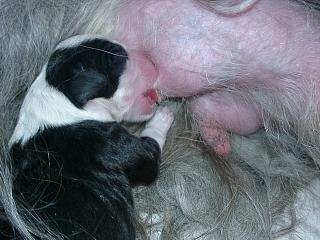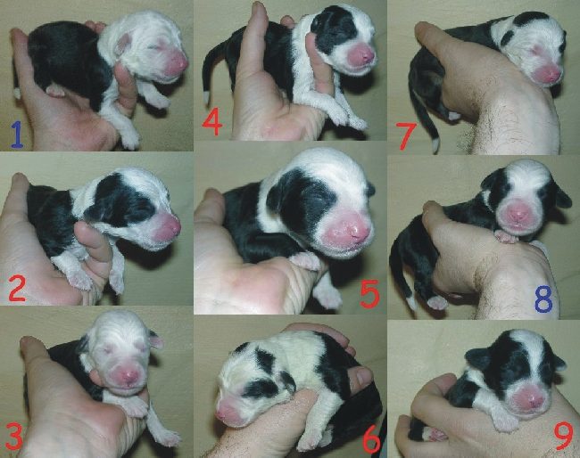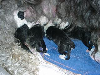 Leute, Mama und wir hatten uns das vorher so ausgemacht. Nachdem ja unsere älteren "Geschwister" des A-Wurfes bereits Sonntagskinder waren, wollten wir natürlich auch welche werden. Aber da wir ja so viele sind und der Sonntag, den wir uns ausgesucht hatten, Mamas 65. Trächtigkeitstag war, war es nicht ganz so einfach für sie. Immerhin hatten wir (ohne Fruchtwasser und Nachgeburten) zusammen 3.236 Gramm Lebendgewicht. Aber sie hat das ganz toll weggesteckt. Das Gewicht und die 9 Stunden, die die Geburt gedauert hat. (Herrchen und Frauchen waren da sicher mehr geschafft). Als erster kam um 15.48 Uhr Nr. 1 (ein Rüde) mit 395 Gramm zur Welt. Dann kamen in teilweise recht großen Abständen die Nummern 2, 3, 4, 5 und 6 .... alles Mädels: 16.08 Uhr - Hündin 322