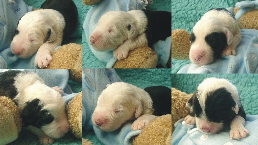 sich das zu behalten - Das sind die Namen, die in unsere Ahnentafeln kommen ... aber Mama hat uns schon erzählt, dass man uns wahrscheinlich auch in Zukunft "Dicker", "Yodababy" oder "Pfeilchen" nennen wird. Da fragt man sich doch, warum nicht gleich "Bushwagger's Dicker" in der Ahnentafel stehen kann. Und damit sich jeder diese Namen anschauen und merken kann, werden wir hier einzeln und sogar mit Musik vorgestellt ... nur uns, uns nützt das noch gar nichts, denn wir können ja noch nichts sehen und auch noch nichts hören. Aber bald ... Eure sechs Bushwagger