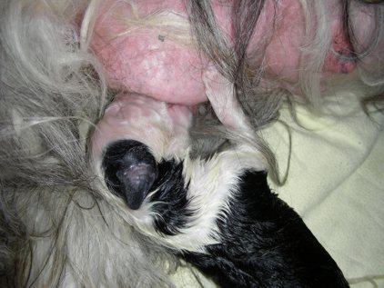 na das war ein ganz schönes Stück Arbeit ... und gedauert hat es über 11 Stunden. Aber es hat sich gelohnt - 8 wunderschöne Babys hab ich jetzt - drei Jungs und fünf Mädels - insgesamt 4,4 Kilogramm tolle kleine Hunde. Die Einzelgewichte von 445 bis 647 Gramm sind auf jeden Fall nicht von schlechten Eltern. Und auch sonst sind wir alle sehr, sehr, sehr zufrieden mit dem Resultat. Rechts dieses ganz besondere Foto hat Adrian während der Geburt des zweiten Rüden gemacht, der noch vollständig in der Eihaut eingepackt ist. Wer mag, kann sich das Foto hier auch noch größer anschauen. Und hier folgen die Fotos, die Herrchen jeweils innerhalb von 15 Minuten nach der Geburt gemacht hat. Ich hab ihm zwar gesagt, er solle ein wenig auf meine Intimsphäre achten, aber das hat er mal wieder nicht gehört. Männer... kennste einen, kennste alle.