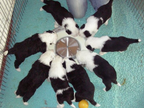 Hallo, jetzt wundert ihr euch sicher, wieso wir schon wieder was schreiben, wo wir uns doch erst vorgestern zu Wort gemeldet hatten ... Das hat silberne Gründe. Gestern nachmittag kamen nämlich Frauchen und Herrchen auf die Idee, das silberne Geschirr aus dem Schrank zu holen. Und das kam so: Mama war fertig mit Säugen, aber wir noch nicht ganz satt ... also gab es einen Nachschlag aus - ja, jetzt seid ihr sicher platt - aus einem silbernen Teller. Naja, eigentlich war es ja gar kein Teller, sondern eher was größeres, aber auf jeden Fall war es silbern. Schaut hier: