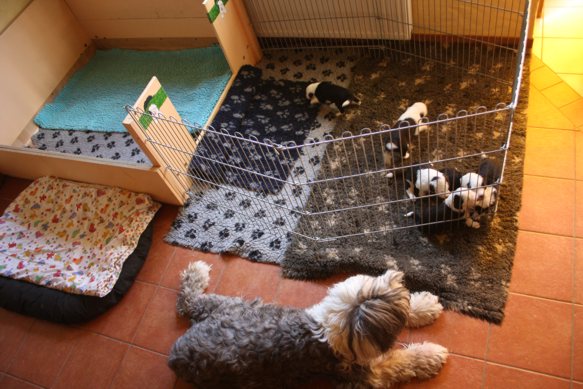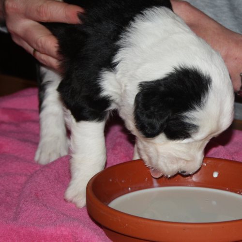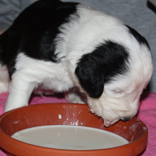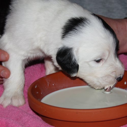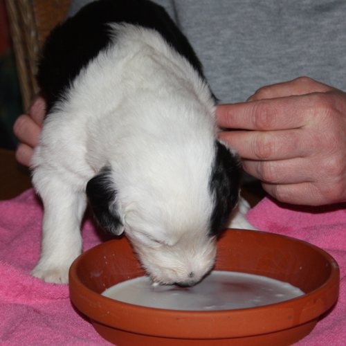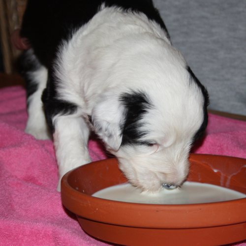 Gestern morgen fing es an. Wir schliefen noch, als die Bagger anrollten ... naja, so hörte es sich wenigstens an. Herrchen hat geräumt, geschraubt, gesteckt und geschoben und dann, ja dann war unsere Veranda fertig. Mit Sonnenliege und Aussicht ins Grüne. Und zur Feier des Tages kam unsere Uroma Curly zu Besuch. Das war toll. Aber damit noch nicht genug. Abends dann ging es genauso geheimnisvoll weiter. Diesmal war Frauchen an der Reihe. Sie räumte ihr bestes Essgeschirr (vielleicht war es auch das zweitbeste, ist aber auch egal) auf den Tisch und dann passierte es: Wir schlabberten - erst mal einer nach dem anderen - unsere erste Milchmahlzeit aus einem Schüsselchen. Zwei von uns mussten erst mal prusten und schnauben, weil Milch ins Näschen kam - und einer stellte sich gar mitten in die Milch hinein, aber es dauerte gar nicht lange und wir alle sechs leckten und schleckten, was das Zeug hielt. So als hätten wir nie etwas anderes gemacht. Herrchen hat Beweisfotos gemacht, die ihr unten auf der Seite sehen könnt. Mann, das war ein Tag. Jetzt sind wir groß. Bis bald. Eure sechs Bushwagger