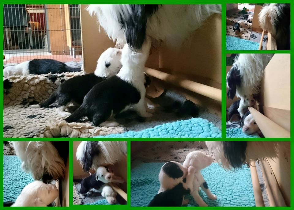 mehr Platz, große Verwandte und hohe Gewichte, das also sind die Großereignisse, die Herrchen gemeint hat. Aber der Reihe nach. Als erstes haben Frauchen und Herrchen in dieser Woche angebaut. Wir durften den begrenzten Platz unserer Wurfkiste verlassen und nun, da wir etwas sehen und auch unsere Bewegungen sicherer und raumgreifender geworden sind, einen weiteren großen Teil des Wohnzimmers beziehen. Und man munkelt, dass dieser Platz sogar nach und nach noch größer werden soll. Und dort im Wohnzimmer haben wir jemanden kennengelernt. Jemanden, der irgendwie so aussieht wie Mama, aber nicht ganz so groß ist und auch anders riecht. Mama sagt, es sei die sieben Monate alte Tochter ihrer Tochter und sie heiße LaKisha. Also das sind schon komische Familienverhältnisse hier. Wenn sie die Tochter von Mamas Tochter ist und wir sind die Töchter und Söhne von Mama, dann ist LaKisha ja unsere Nichte und wir sind ihre Onkel und Tanten. Und das, obwohl wir so klein sind und sie so groß. Jedenfalls ist sie schon von Anfang an sehr interessiert an uns und will uns unbedingt kennenlernen. Das liegt wahrscheinlich daran, dass sie keine Geschwister hatte wie wir und bisher außer ihrer Mama, Oma und Uroma niemanden zum spielen hatte. Und das will sie nun nachholen. Sie ist auch ganz vorsichtig und Mama lässt sie auch mittlerweile an uns heran. Die ersten zwei, drei Wochen wollte sie das nicht so gerne, weil wir ja noch so klein und zerbrechlich waren, aber jetzt erlaubt sie ihr, uns zu beschnuppern und zu beschlabbern. Schaut selbst auf den Fotos oben. Mit den ganz wilden Spielen werden wir wohl noch ein wenig warten, aber das geht sicher auch bald los. Wir sind nämlich schon ganz schön groß geworden und haben alle kurz hintereinander die Kilomarke geknackt.