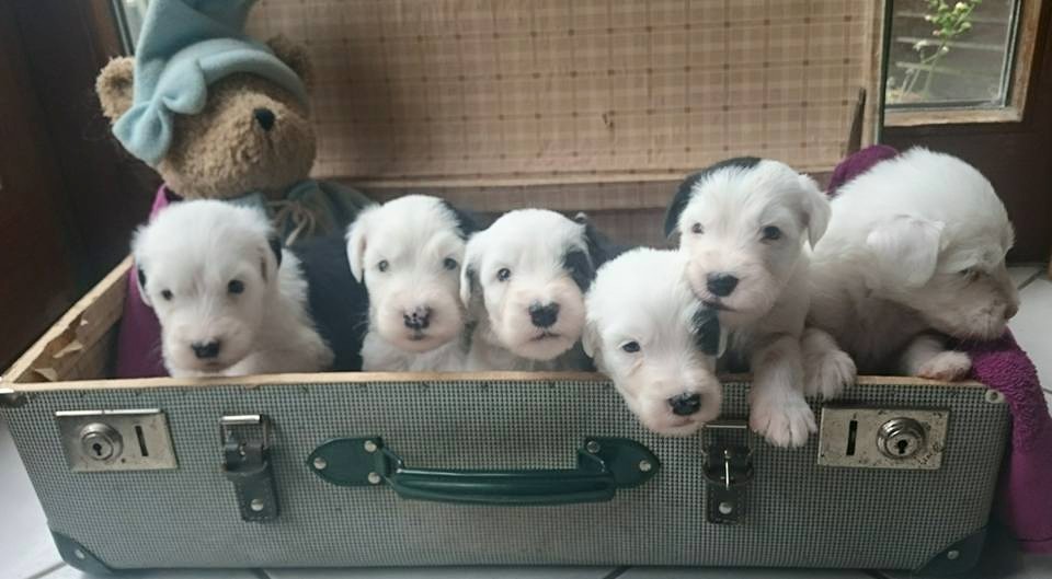 Bushwagger's Harry Potter (2.v.r.) "Harry" ist versprochen nach Frankreich Ein zauberhafter Name für einen zauberhaften Jungen, unseren "Ersten", der zwar keine blitzförmige Narbe auf der Stirn trägt, aber dafür ein keckes Abzeichen auf dem Kopf und am rechten Ohr. Bushwagger's Han Solo (2.v.l.) "Eirik" ist versprochen nach Luxemburg Unser kleiner Draufgänger wird den großen Namen eines großen Star-Wars-Helden tragen. Bereits in den ersten Tagen an Mamas Milchbar waren Abenteuerlust und Selbstbewusstsein bei unserem "Dicken" zu erkennen. Bushwagger's Hakuna matata (1.v.r.) "Pünktchen" ist versprochen in den WesterwaldDer Spruch, den man aus dem Musical "König der Löwen" kennt, stammt aus der afrikanischen Sprache Swahili und bedeutet wörtlich übersetzt „Es gibt keine“ (hakuna) „Probleme/ Schwierigkeiten“ (matata). Oder umgangssprachlich „Alles in bester Ordnung“. Und so ist es auch. Bei "Pünktchen" stimmt alles. Bushwagger's Horatio Hornblower (3.v.r.) sucht noch ein Zuhause ist versprochen in den Westerwald Auch wenn Horatio Hornblower, eine Romanfigur von C.S.Forester, kein Pirat ist, so ist er doch Seefahrer und dadurch ist das der passende Name für diesen kleine Kerl mit der Augenklappe, der von Beginn an den Spitznamen "Pirat" hatte. Bushwagger's Henry Higgins (3.v.l.) "Henry" ist versprochen in den Westerwald Unser zerstreuter Professor, der in seinen ersten Lebenstagen manches Mal vor lauter Träumen vergaß, zu essen, wird den Namen der männlichen Hauptfigur aus dem Musical "My fair Lady" tragen. Dies ist auch eine Erinnerung an unser Irische Wolfshündin "Eliza Doolittle", die ihr Leben lang glaubte, sie sei ein etwas zu groß geratener Bobtail. Bushwagger's Here's to Genesis (1.v.l.) "Söckchen" ist versprochen nach Westfalen Here's to..., so beginnen im Englischen Toasts oder Trinksprüche.