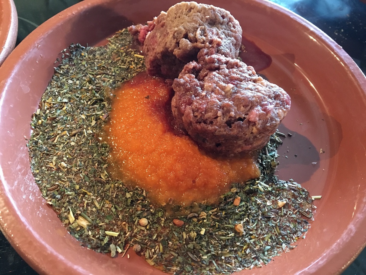 Ansonsten gibt es nicht allzu viel zu berichten. Wir spielen, schlafen und essen. Ah ja, essen ... unser Speiseplan wird immer vielfältiger. Es gibt mittlerweile vier Mahlzeiten am Tag - morgens Quark mit Banane und Ziegenmilch und dann drei Fleischmahlzeiten. Mal Lamm, mal Rindfleisch und mal Rinderherz. Immer mit Gemüse und Kräutern.Hier ein Auszug aus unserer Speisekarte (Mittagsmenü): Der Küchenchef empfiehlt: Mageres Rinderherz, fein gewolft, mit einem Jus aus Rinderblut und 30 Kräutern an Möhrchen-Apfel-Püree, mit Distelöl verfeinert. Den Quark gibt es aus dem Futterring, die übrigen Mahlzeiten werden auf Tellern gereicht.