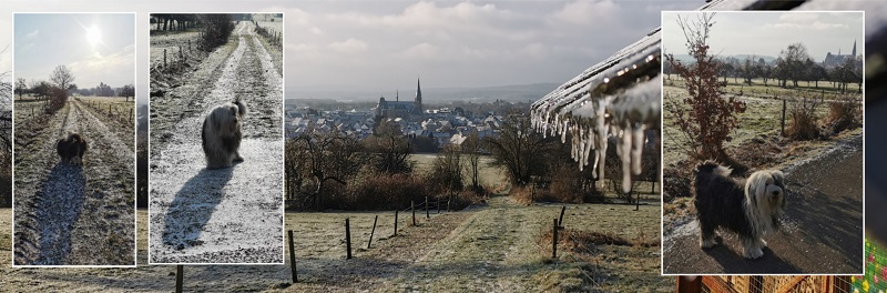 Zum einen waren wir heute bei minus acht Grad und strahlendem Sonnenschein zu einem langen Spaziergang unterwegs. Das hat gut getan, denn das war mal was anderes als ständig hinter dem Ofen zu liegen und zu warten.